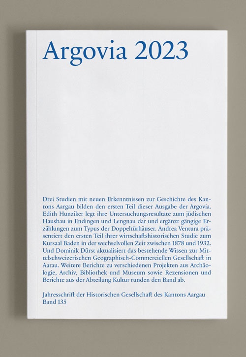 Die Argovia 2023 beinhaltet mehrere neue Studien zum Kanton Aargau im 19. und frühen 20. Jahrhundert. Andrea Ventura präsentiert den ersten Teil ihrer wirtschaftshistorischen Untersuchung zum Kursaal Baden in der wechselvollen Zeit zwischen 1878 und 1932. Edith Hunziker legt Erkenntnisse zum jüdischen Hausbau in Endingen und Lengnau dar und ergänzt gängige Erzählungen zum Typus der Doppeltürhäuser. Und Dominik Dürst ergänzt das bestehende Wissen zur Mittelschweizerischen Geographisch-Commerciellen Gesellschaft in Aarau. Weitere Berichte zu verschiedenen Projekten aus Archäologie, Archiv, Bibliothek und Museum sowie Rezensionen und Berichte aus der Abteilung Kultur ergänzen den Band.