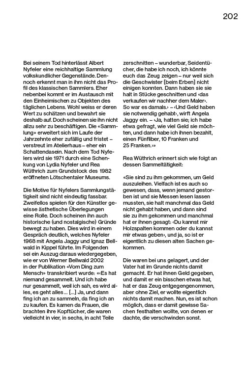 Der Berner Albert Nyfeler kommt 1906 erstmals ins Lötschental. Er arbeitet als Dekorationsmaler bei einer Kirchenrenovation mit und besucht das Tal in der Folge regelmässig. Die Gegend ist ihm künstlerische Inspiration, und so lässt er sich 1922 in Kippel nieder. Bei seinem Tod 1969 hinterlässt der Künstler ein umfangreiches Werk von rund 10 000 Bildern und Tausenden von Fotografien. Es ist ein eindrückliches Zeugnis und ein eigentliches Inventar zur vorindustriellen Alltagskultur eines Alpentals. Das Buch veranschaulicht Nyfelers Schaffen anhand der Bestände des Lötschentaler Museums und der Mediathek Wallis. Es konzentriert sich geografisch auf das Lötschental als hauptsächlichem Wirkungsfeld des Künstlers und als Referenzraum des Museums. Albert Nyfeler war ein visueller Erzähler, der ein Werk geschaffen hat, dessen Aussagekraft und Wirkung allerdings weit über die Region und die Zeit, in der es entstanden ist, hinausreicht.