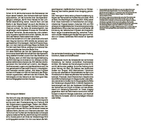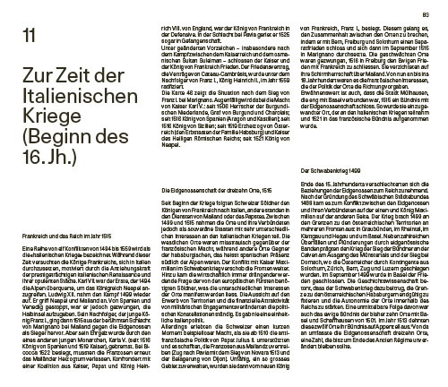 Schwächen natürlich bewusst. Daher zeigen sie die wachsende Eidgenossenschaft fast immer mit ihrer Umgebung, um auf die Verflechtung mit Europa hinzuweisen. Eine feine Linie deutet jeweils die Umrisse der heutigen Schweiz an – und schon hat der Leser zwei Zeiten vor sich. Springt er dann noch vor- und rückwärts zwischen den Seiten und Jahrhunderten, kommen noch mehr Zeiten und auch Räume dazu.