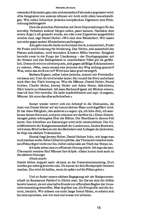 Die Autorin Michèle Minelli und die Fotografin Anne Bürgisser haben Schweizer Jenische über zwei Jahre auf Durchgangsplätzen besucht und auf Veranstaltungen begleitet. Ihre Reportagen und Porträts führen an aktuelle Brennpunkte heran, hinterfragen Klischees und dokumentieren den jenischen Alltag. Sie zeigen, wie Jenische den Spagat zwischen Anpassung und Freiheit schaffen und wo Verständigung zwischen der Welt der Sesshaften und der Welt der Fahrenden möglich ist.