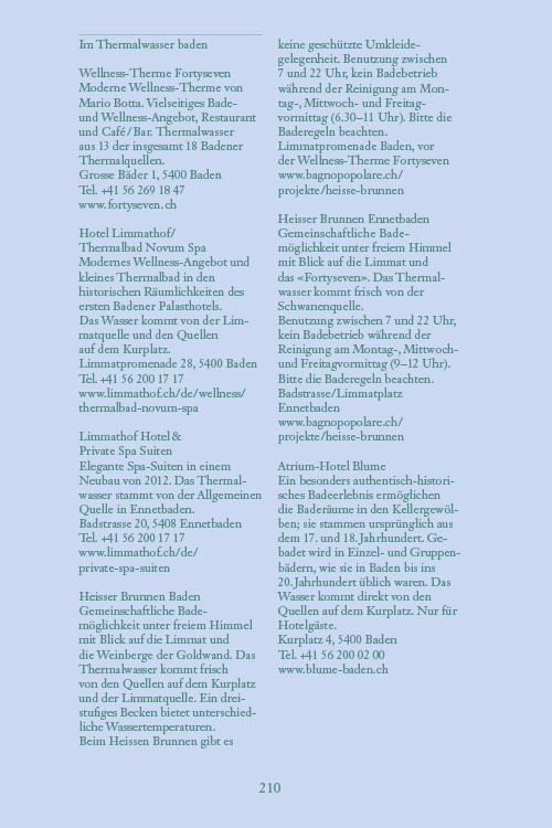 «Die fundierte Recherche, abgerundet von einem umfangreichen Serviceteil, liest sich, als ob all dieses Wissen so leicht aus ihrer Feder sprudle wie das schwefelhaltige heisse Wasser aus Badens Untergrund.» Sabine von Fischer in TEC21